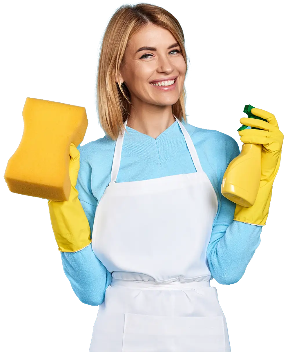 Junge Frau hält Reinigungsmittel in der Hand und lächelt in die Kamera